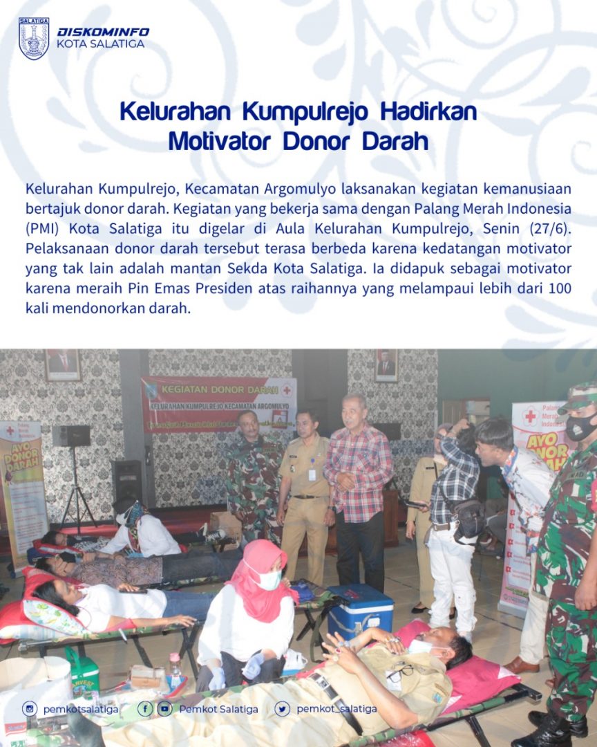 Pelaksanaan donor darah tersebut terasa berbeda karena kedatangan motivator yang tak lain adalah mantan Sekda Kota Salatiga. Ia didapuk sebagai motivator karena meraih Pin Emas Presiden atas raihannya yang melampaui lebih dari 100 kali mendonorkan darah. Disampaikannya, mendonorkan darah terakhir pada tahun 2017 dengan 110 kali. “Saya diminta menjadi motivator saja, saya sendiri saat ini sudah tidak lagi melakukan donor darah dan terakhir ke-110 di tahun 2017 silam”.