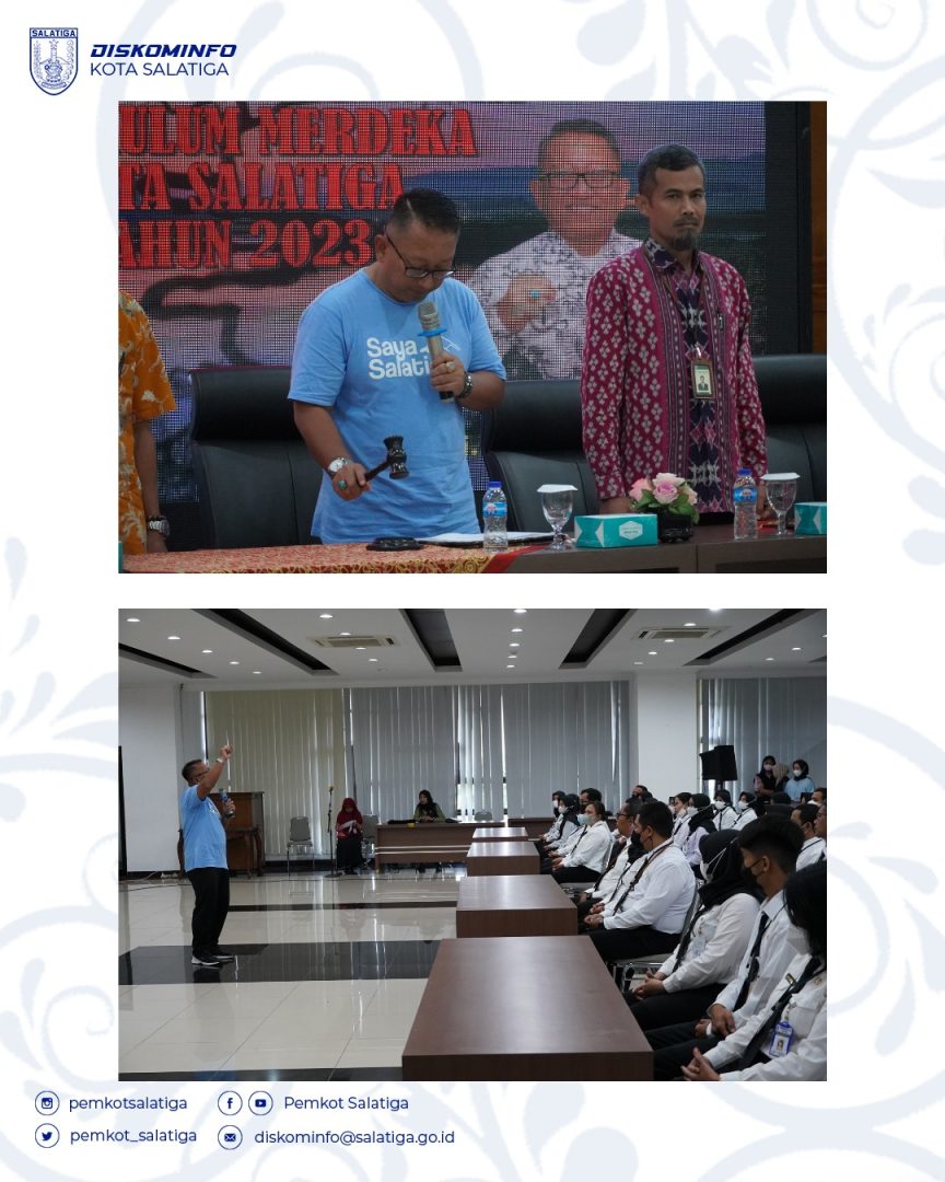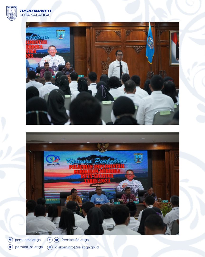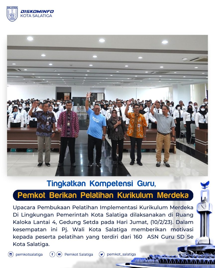 Upacara Pembukaan Pelatihan Implementasi Kurikulum Merdeka di Lingkungan Pemerintah Kota Salatiga dilaksanakan di Ruang Kaloka Lantai 4, Gedung Sekda pada Hari Jumat, (10/2/23). Acara tersebut dihadiri oleh Pj. Wali Kota Salatiga, Plt. Kepala BKPSDM Kota Salatiga, Narasumber dari Balai Besar Penjamin Mutu Pendidikan Provinsi Jawa Tengah dan segenap peserta pelatihan yang terdiri dari 160 ASN Guru SD Se Kota Salatiga.