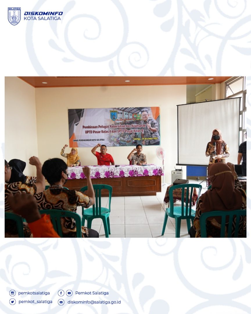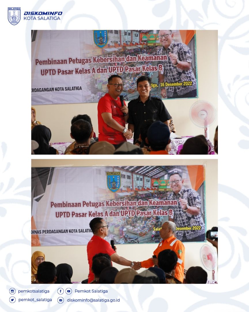 Pemerintah Kota Salatiga melalui Dinas Perdagangan menyelenggarakan Pembinaan Petugas Kebersihan dan Keamanan Pasar UPTD Pasar Kelas A dan UPTD Pasar Kelas B di Aula Dinas Perdagangan Kota Salatiga pada Hari Jumat (16/12). Penjabat Wali Kota Salatiga yang hadir dalam acara tersebut berkenan memberikan pembinaan secara langsung kepada para petugas kebersihan dan keamanan pasar. Pada sesi pembinaan, Pj. Wali Kota mengundang perwakilan dari petugas keamanan dan kebersihan secara bergantian untuk maju ke depan. Dengan pembawaannya yang santai dan menghibur, beliau bertanya kepada para petugas tersebut terkait suka duka dan harapan dalam mengemban tugas setiap harinya. Pada kesempatan tersebut, perwakilan dari petugas keamanan dan kebersihan menyampaikan beberapa fasilitas yang mereka harapkan dapat dipenuhi oleh pemerintah seperti pemasangan cctv, pengadaan seragam serta pengadaan pos yang layak. Menanggapi hal tersebut, Pj. Wali Kota meminta agar Kepala Dinas Perdagangan Kota Salatiga segera menindaklanjuti perihal fasilitas yang diminta oleh para petugas keamanan dan kebersihan. Selain itu, Sinoeng juga meminta agar dilaksanakan pemeriksaan kesehatan minimal 3 bulan sekali sekaligus kegiatan refreshing bagi petugas kebersihan dan kemanan UPTD Pasar Kelas A dan B. Di akhir acara, Pj. Wali Kota berpesan agar para petugas keamanan dan kebersihan untuk selalu menjaga kesehatan diri dan keluarga.