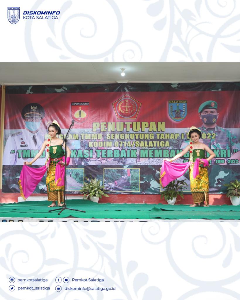 Kegiatan TNI Manunggal Membangun Desa (TMMD) Sengkuyung tahap 1 T.A 2022 resmi ditutup. Penutupan TMMD dengan tema “TMMD Dedikasi Terbaik Membangun NKRI” dilaksanakan di Lapangan RW 09 Perum Griya Dukuh Asri, Sidomukti pada Kamis, (9/6). Dalam kegiatan yang bertujuan untuk membantu meningkatkan akselerasi pembangunan daerah itu, dilaksanakan selama 30 hari mulai 11 Mei hingga 9 Juni 2022. Mengawali dan menyambut kedatangan Pj. Wali Kota, Forkopimda dan segenap tamu undangan, dibuka dengan pertunjukan Tari Gambyong.