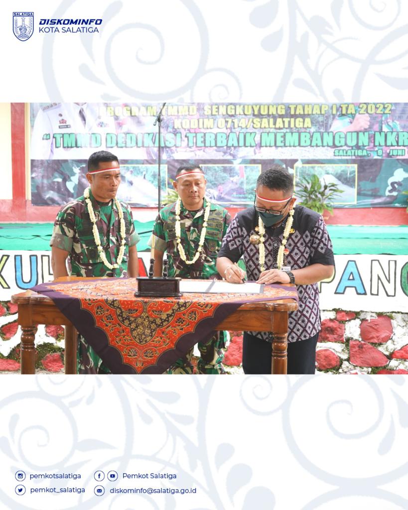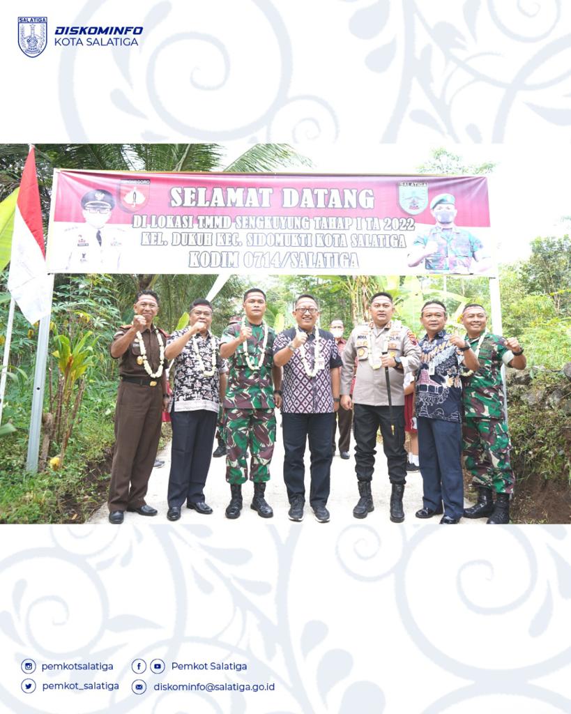Kesempatan yang sama Pj. Wali Kota dan Komandan Kodim 0714 Salatiga berkenan untuk menandatangani berita acara Serah Terima Hasil Pekerjaan TMMD Sengkuyung Tahap 1 T.A 2022 yang disaksikan oleh Pasi Komsos Korem 073/Makutarama. Setelah acara selesai, dilanjutkan peninjauan ke lokasi betonisasi yang diikuti oleh Pj Wali Kota, Forkopimda dan segenap tamu undangan yang hadir. Sesampainya di lokasi, Sinoeng memotong untaian bunga dan berjalan mengitari hasil betonisasi yang disambut oleh guru dan siswa-siswi serta pertunjukan kesenian.